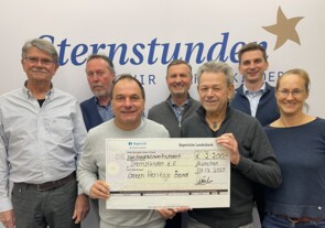 Die Green Heritage Band zu Besuch bei Sternstunden (v. li. n. re): Hans Völkl, Ulrich Scherer, Michael Bolesczuk, Lambert Weber, Sepp Schrengl überreichen einen Scheck über 2200 Euro an Jonathan Kietzke (Öffentlichkeitsarbeit) und Sabine Demmel (Leitung Buchhaltung) (© Foto: Sternstunden)