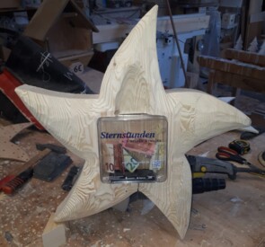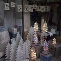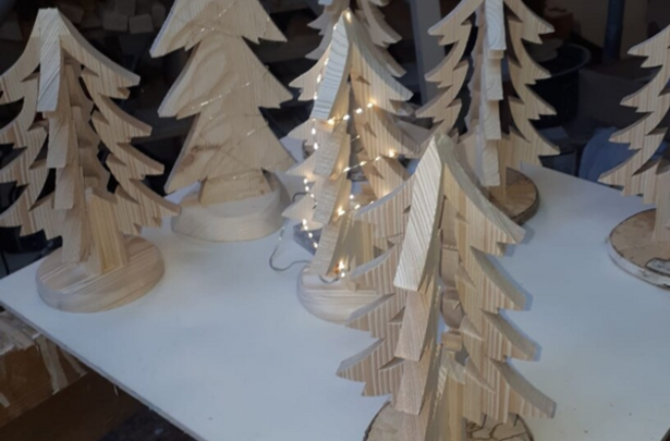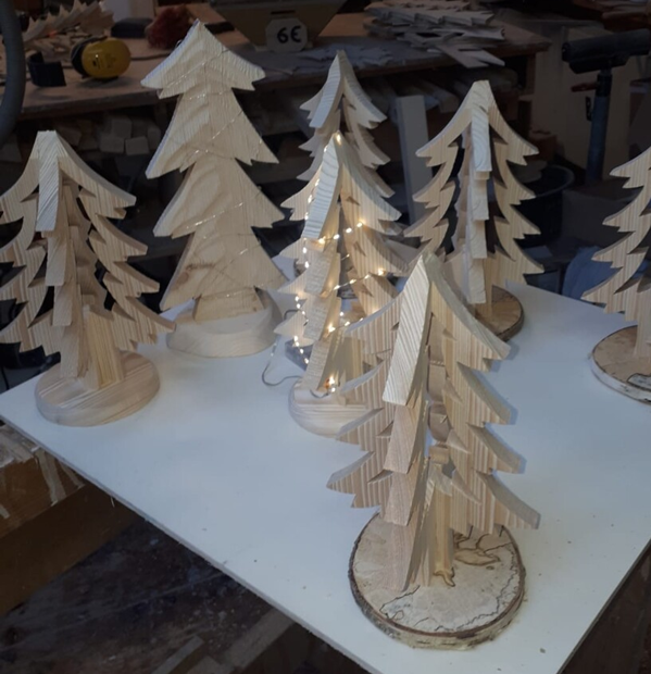 In diesem Jahr haben die beiden für das Adventsgeschäft 65qm Bretter verarbeitet und dadurch 200 Laternen, 80 Christbäume, 1200 Anhänger (Sterne, Herzen, Engel oder Hirsche) und 100 gedrechselte Teller und Schüsseln hergestellt.
