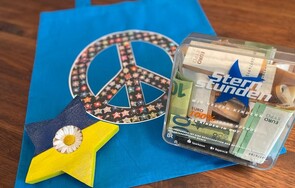 250 Leinentaschen mit einem besonderen Peace-Zeichen wurden von den Kindern Stella und Silas gegen eine Spende abgegeben. So wollten sie einen Beitrag für die Leidtragenden des Ukraine-Kriegs leisten. 1650 Euro sind dabei zusammengekommen. Vielen Dank für diese tolle Idee!