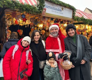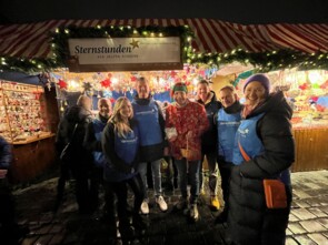 Die Sparkasse Nürnberg ist bereits seit vielen Jahren ein treuer Partner von Sternstunden. So übernahmen die „Roten Engel“, die sich neben ihrer beruflichen Tätigkeit ehrenamtlich für gemeinnützige Projekte in der Region einsetzen, den Stand und berieten die Besucher – doch heute ging es nicht um Anlagestrategien, sondern um das Finden des passenden Sterns. Vor dem Stand traf man eine hochkarätige Besetzung an: Alle Vorstände der Sparkasse Nürnberg sowie der Vorstandsvorsitzende und sogar der Präsident des Sparkassenverbandes Bayern unterstützten beim Spendensammeln.