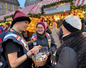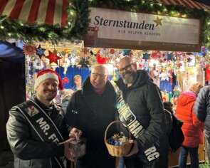 Mit seinem Slogan „öffnen Sie Ihre Herzen und Ihre Geldbeutel“ gelang es Schneider, seine Spendenbox mit 776,87€ zu füllen. Vielen Dank für die tolle Summe von 2956,87€, die dank der Unterstützung des Starfriseurs für Kinder in Not eingesetzt werden kann. Am heutigen Tag bekam Sternstunden doppelte Unterstützung. Nachdem der Nikolaus weitergezogen war, besuchten Titelträger der queeren Community den Stand und sammelten Spenden. Die Lederoutfits weckten das Interesse der Menschen und es entstand ein schöner Austausch.