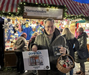 Während der Stunde, die Oliver Schott mit seiner Frau am Stand verbrachte, leerte sich sein Körbchen mit einer Auswahl an schönen Sternen einige Male und die Spendendose füllte sich. Stattliche 348,40€ sammelten die beiden für Sternstunden. Vielen herzlichen Dank!