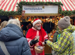 Marcel Schneider setzt sich gerne in seiner Freizeit für den guten Zweck ein. Erst vergangenen Mittwoch veranstaltete er eine Benefizveranstaltung mit Oliver Tissot. Bei der Lesung im Friseursalon stellte Tissot sein neues Buch vor. Dank Buchverkäufen und Spenden kamen 2180€ zusammen. Schneider entschied sich dazu, das Geld Sternstunden zugutekommen zu lassen. Doch damit nicht genug – denn er möchte noch mehr geben. Und so schlüpfte er in das Nikolauskostüm und gab zwei Stunden lang vor dem Stand alles. Groß und Klein freuten sich über die Begegnung mit dem Nikolaus.
