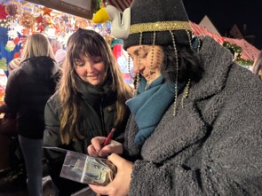 Zwei Damen aus Michigan, die eigens für den weltberühmten Christkindlesmarkt angereist waren, ließen sich von der festlichen Atmosphäre und dem Engagement von Sternstunden verzaubern. Ihre Begeisterung für die selbstgebastelten Sterne und die gute Sache war spürbar – und ihre großzügige Spende unterstrich eindrucksvoll ihre Wertschätzung für den Markt und die Initiative.