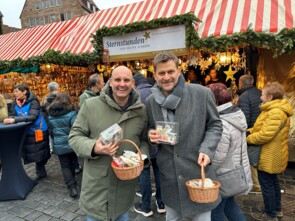 Die Terminkalender der Vorstände sind in der Weihnachtszeit prall gefüllt, doch jedes Jahr lassen sie es sich nicht nehmen, selbst die Dose in die Hand zu nehmen und dekorative Schmuckstücke neuen Besitzern zukommen zu lassen. Selbstverständlich hatte jeder insgeheim das Ziel, die meisten Spenden zu erzielen, sodass voller Einsatz garantiert war. Zudem freut es uns, dass in diesem Jahr noch einmal alle vier Vorstandsmitglieder den Stand beehrten – denn es steht ein personeller Wechsel an: Der aktuelle Vorstandsvorsitzende Dr. Matthias Everding geht Ende des Jahres in den Ruhestand. Matthias Wittmann steht bereits in den Startlöchern und wird das Amt ab 1.1.2026 übernehmen. Wir wünschen für die neue Aufgabe bereits alles Gute!
