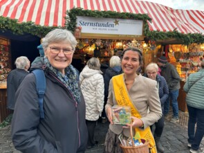 Zwei Damen aus Michigan, die eigens für den weltberühmten Christkindlesmarkt angereist waren, ließen sich von der festlichen Atmosphäre und dem Engagement von Sternstunden verzaubern. Ihre Begeisterung für die selbstgebastelten Sterne und die gute Sache war spürbar – und ihre großzügige Spende unterstrich eindrucksvoll ihre Wertschätzung für den Markt und die Initiative.